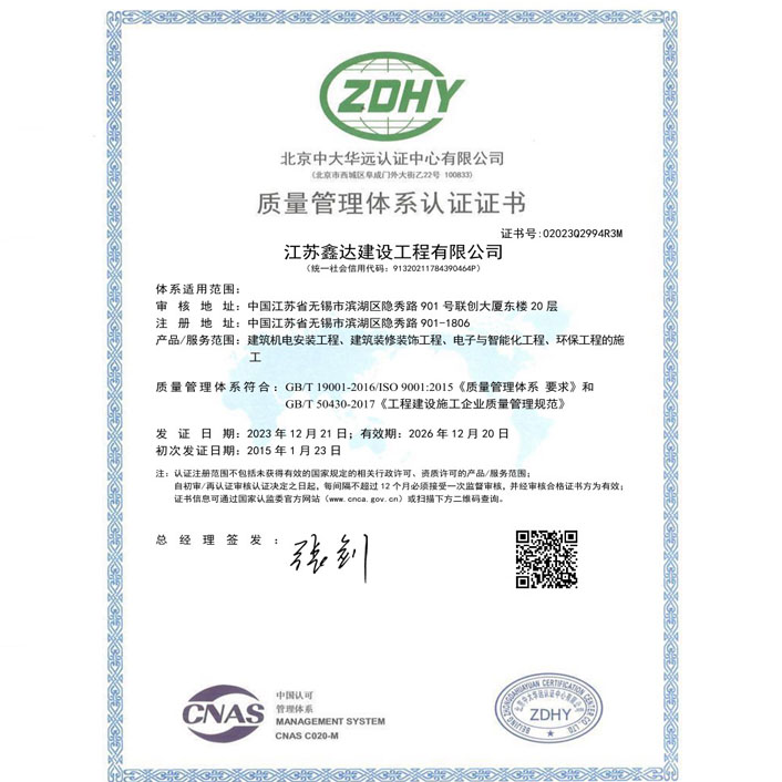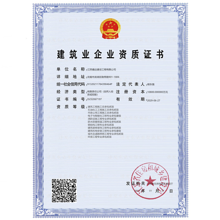 • 机电工程施工总承包壹级 • 电子与智能化工程专业承包壹级 • 建筑机电安装工程专业承包壹级 • 消防设施工程专业承包贰级 • 防水防腐保温工程专业承包贰级 • 建筑装修装饰工程专业承包贰级 |