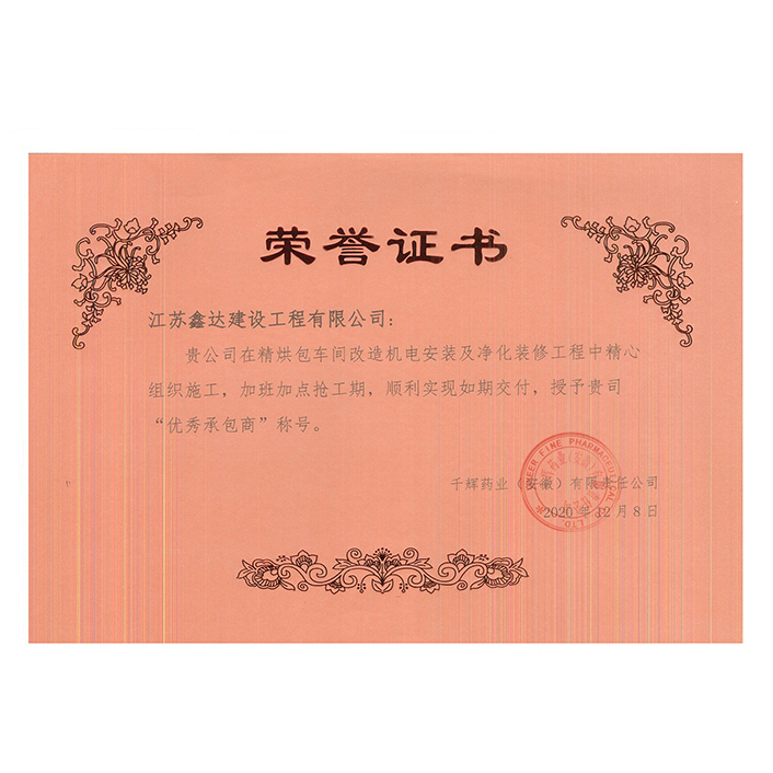 2020年优秀分包商(千辉药业)